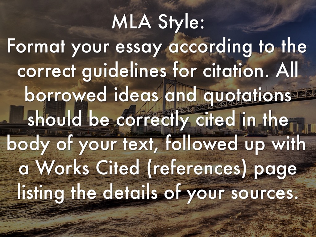 MLA Style: Format your essay according to the correct guidelines for citation. All borrowed ideas and quotations should be correctly cited in the body of your text, followed up with a Works Cited (references) page listing the details of your sources.