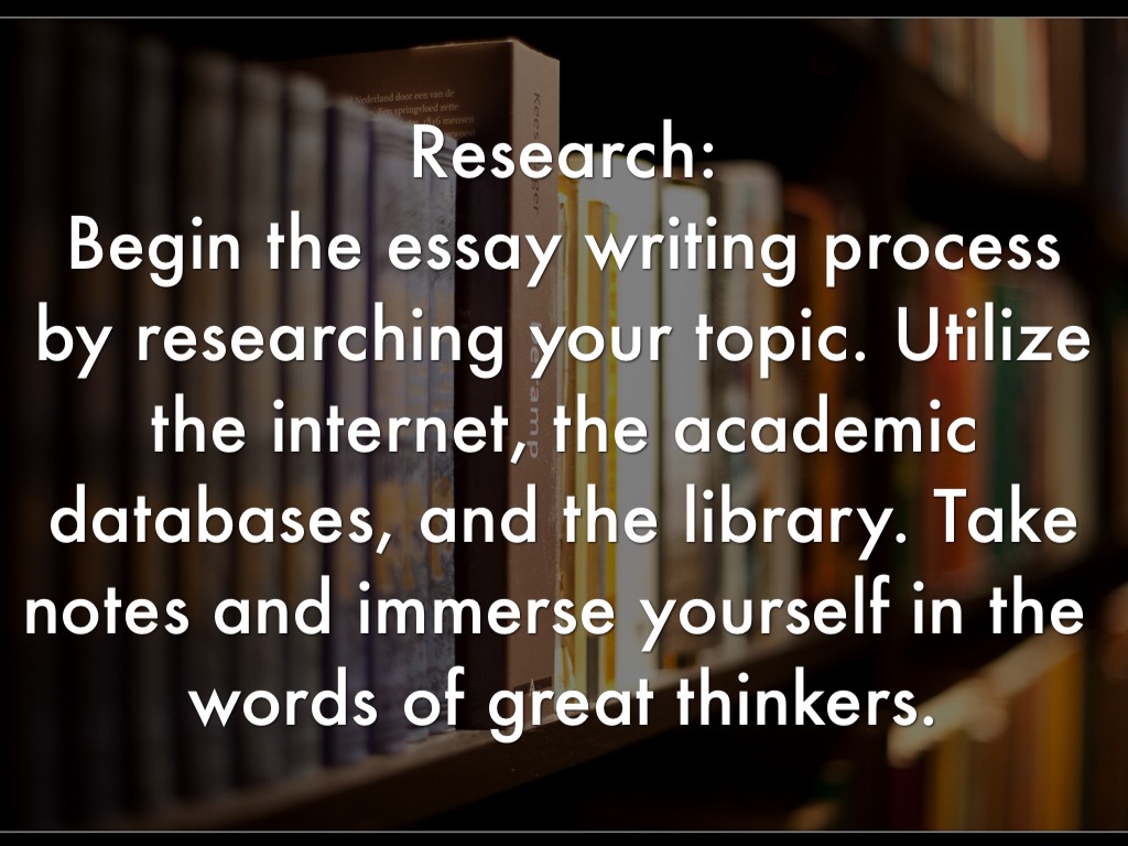 Research: Begin the essay writing process by researching your topic. Utilize the internet, the academic databases, and the library. Take notes and immerse yourself in the words of great thinkers.