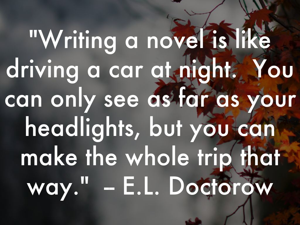 "Writing a novel is like driving a car at night. You can only see as far as your headlights, but you can make the whole trip that way." -- E.L. Doctorow