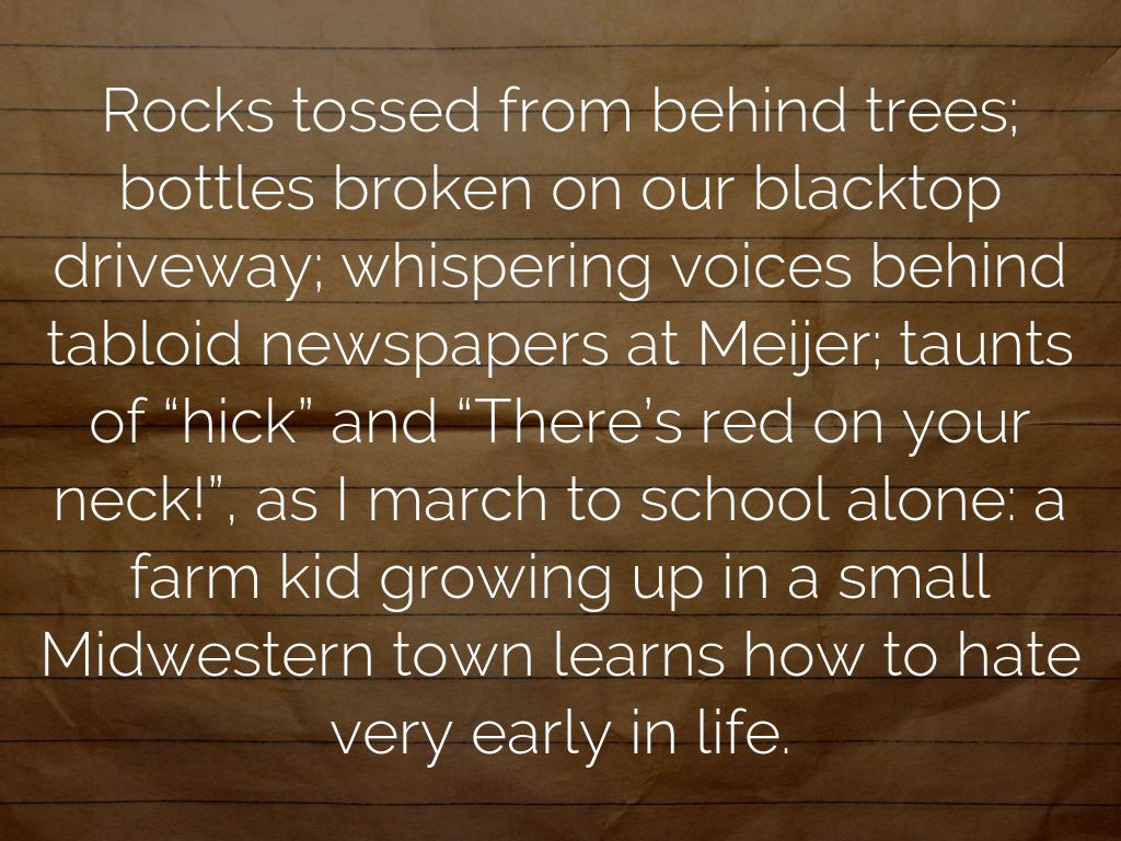 Rocks tossed from behind trees; bottles broken on our blacktop driveway; whispering voices behind tabloid newspapers at Meijer; taunts of “hick” and “There’s red on your neck!”, as I march to school alone: a farm kid growing up in a small Midwestern town learns how to hate very early in life.