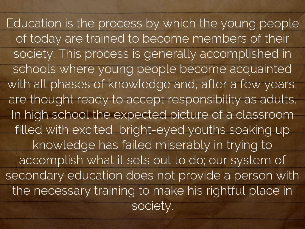 Education is the process by which the young people of today are trained to become members of their society. This process is generally accomplished in schools where young people become acquainted with all phases of knowledge and, after a few years, are thought ready to accept responsibility as adults. In high school the expected picture of a classroom filled with excited, bright-eyed youths soaking up knowledge has failed miserably in trying to accomplish what it sets out to do; our system of secondary education does not provide a person with the necessary training to make his rightful place in society.