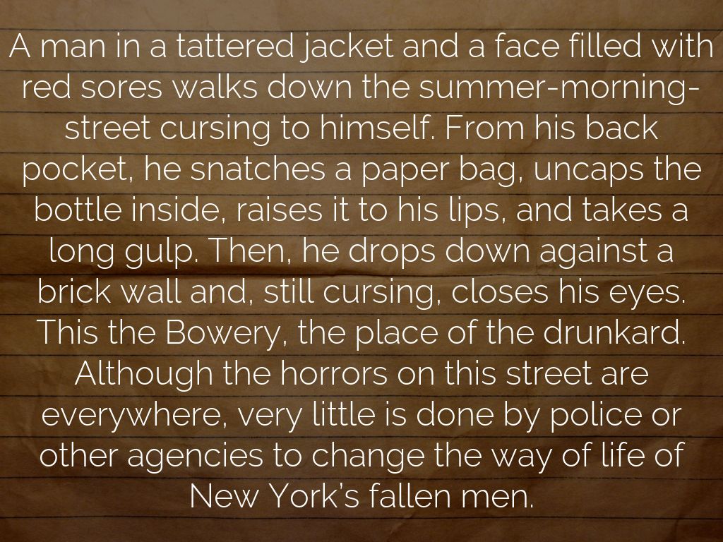 A man in a tattered jacket and a face filled with red sores walks down the summer-morning-street cursing to himself. From his back pocket, he snatches a paper bag, uncaps the bottle inside, raises it to his lips, and takes a long gulp. Then, he drops down against a brick wall and, still cursing, closes his eyes. This the Bowery, the place of the drunkard. Although the horrors on this street are everywhere, very little is done by police or other agencies to change the way of life of New York’s fallen men.