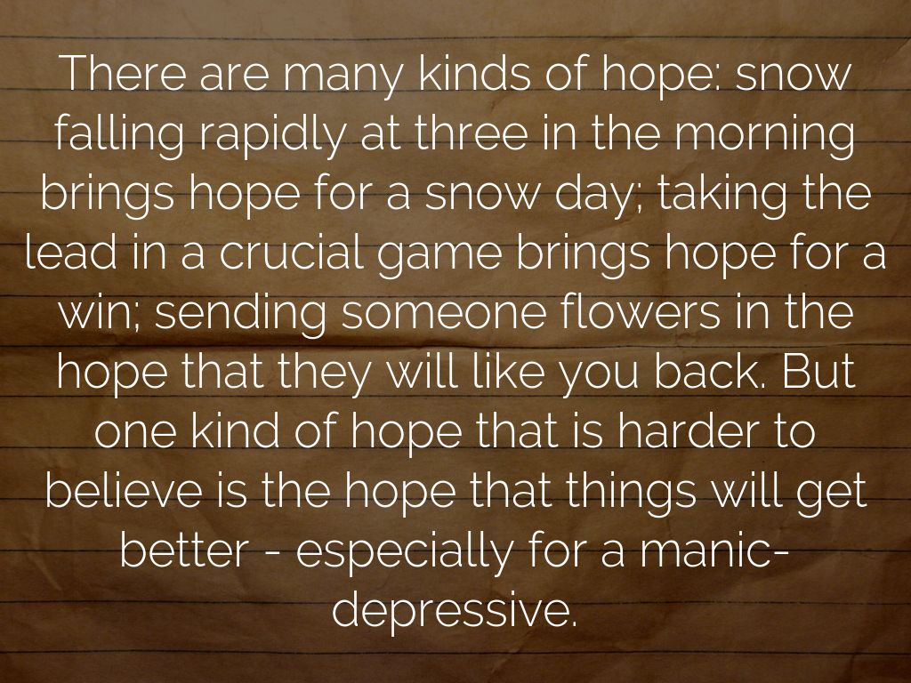There are many kinds of hope: snow falling rapidly at three in the morning brings hope for a snow day; taking the lead in a crucial game brings hope for a win; sending someone flowers in the hope that they will like you back. But one kind of hope that is harder to believe is the hope that things will get better - especially for a manic-depressive.