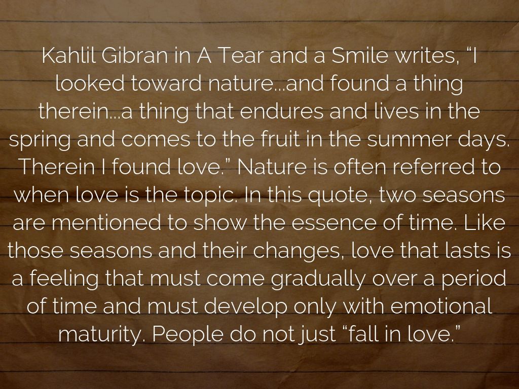 Kahlil Gibran in A Tear and a Smile writes, “I looked toward nature...and found a thing therein...a thing that endures and lives in the spring and comes to the fruit in the summer days. Therein I found love.” Nature is often referred to when love is the topic. In this quote, two seasons are mentioned to show the essence of time. Like those seasons and their changes, love that lasts is a feeling that must come gradually over a period of time and must develop only with emotional maturity. People do not just “fall in love.”