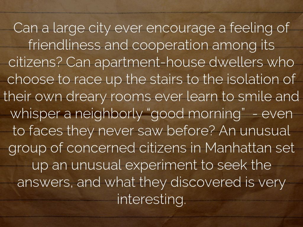 Can a large city ever encourage a feeling of friendliness and cooperation among its citizens? Can apartment-house dwellers who choose to race up the stairs to the isolation of their own dreary rooms ever learn to smile and whisper a neighborly “good morning” - even to faces they never saw before? An unusual group of concerned citizens in Manhattan set up an unusual experiment to seek the answers, and what they discovered is very interesting.