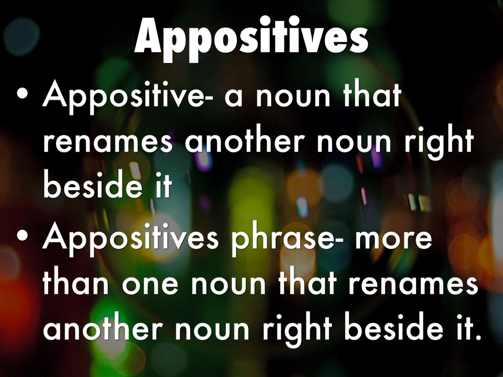 • Appositive- a noun that renames another noun right beside it
