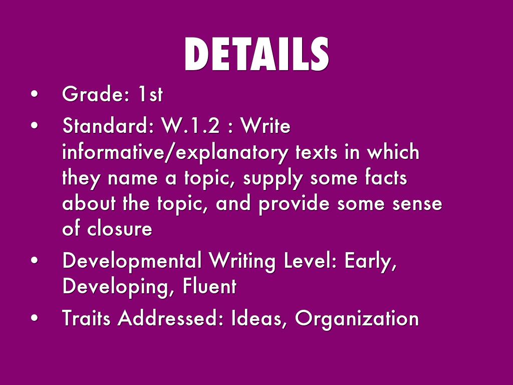 • Standard: W.1.2 : Write informative/explanatory texts in which they name a topic, supply some facts about the topic, and provide some sense of closure