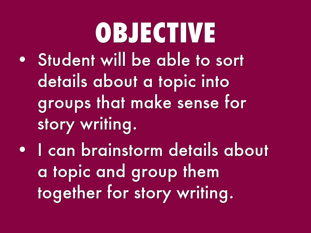 • Student will be able to sort details about a topic into groups that make sense for story writing.