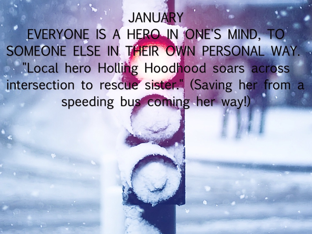 "Local hero Holling Hoodhood soars across intersection to rescue sister." (Saving her from a speeding bus coming her way!)