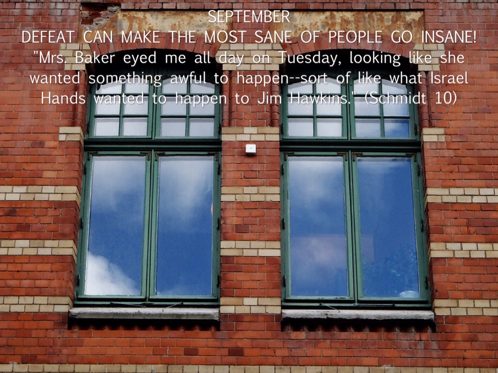 "Mrs. Baker eyed me all day on Tuesday, looking like she wanted something awful to happen--sort of like what Israel Hands wanted to happen to Jim Hawkins." (Schmidt 10)