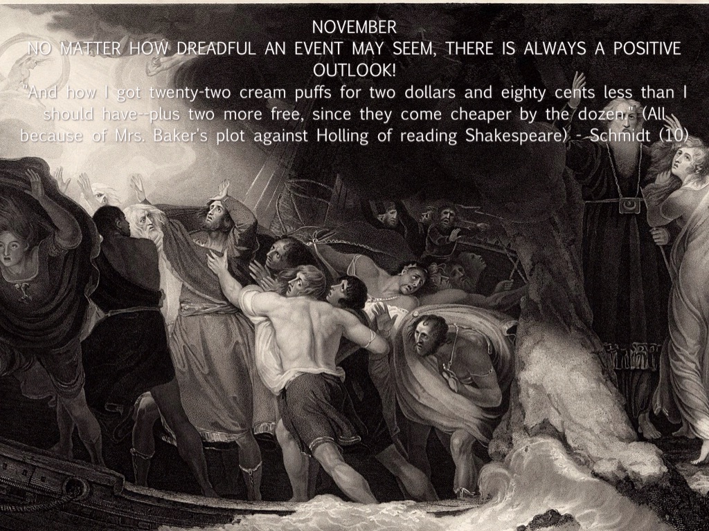 "And how I got twenty-two cream puffs for two dollars and eighty cents less than I should have--plus two more free, since they come cheaper by the dozen." (All because of Mrs. Baker's plot against Holling of reading Shakespeare) - Schmidt (10)