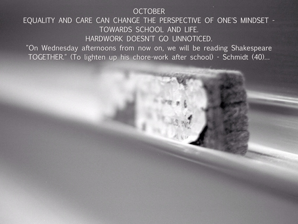 "On Wednesday afternoons from now on, we will be reading Shakespeare TOGETHER." (To lighten up his chore-work after school) - Schmidt (40)