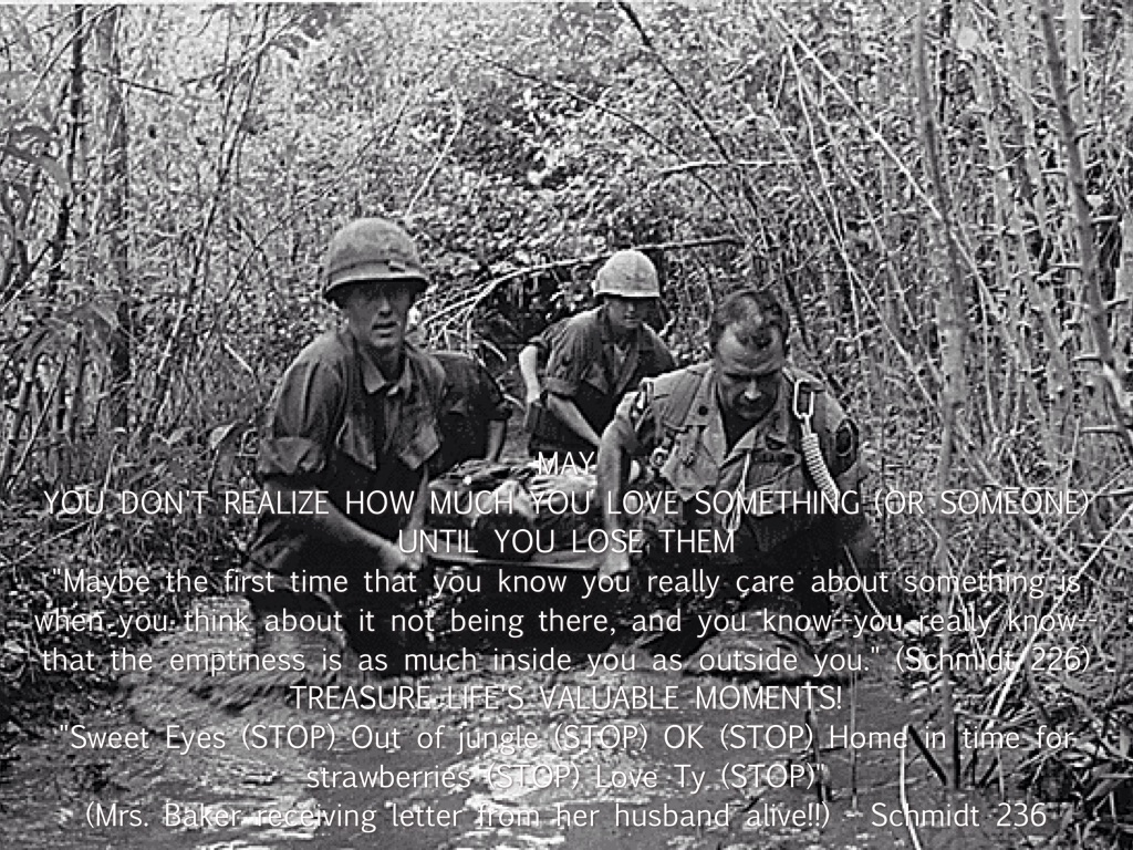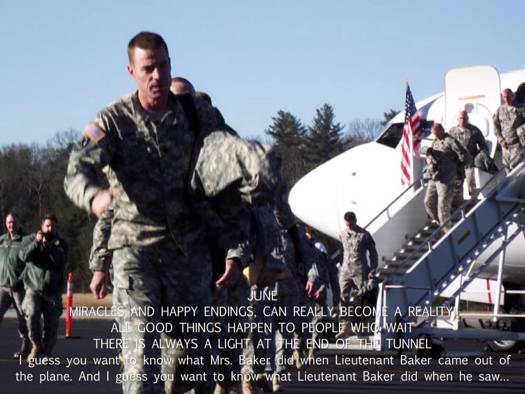 "I guess you want to know what Mrs. Baker did when Lieutenant Baker came out of the plane. And I guess you want to know what Lieutenant Baker did when he saw Mrs. Baker on the tarmac...because let me tell you, it was a HAPPY ENDING." (Schmidt 263-264)f