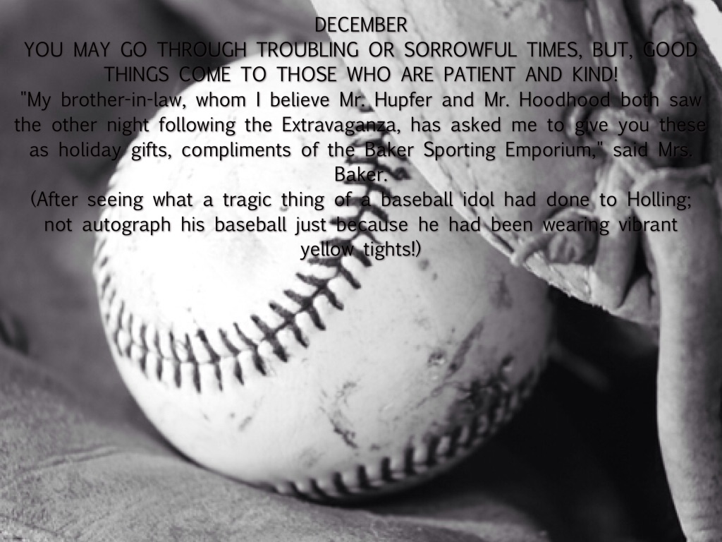 "My brother-in-law, whom I believe Mr. Hupfer and Mr. Hoodhood both saw the other night following the Extravaganza, has asked me to give you these as holiday gifts, compliments of the Baker Sporting Emporium," said Mrs. Baker.