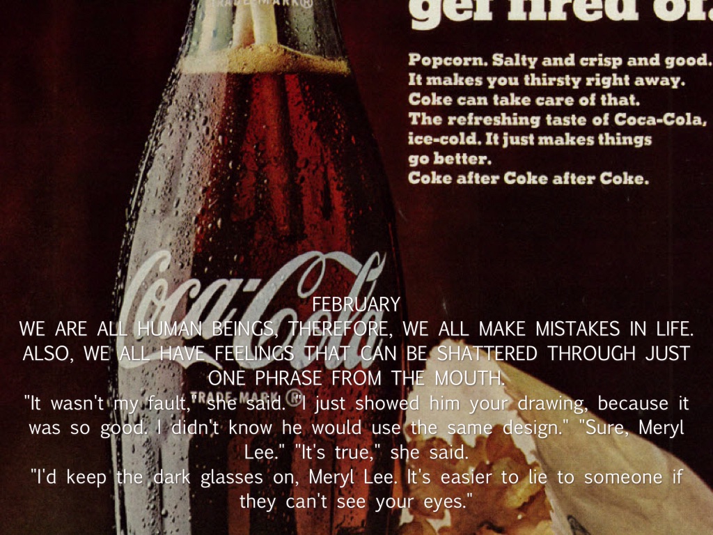 "It wasn't my fault," she said. "I just showed him your drawing, because it was so good. I didn't know he would use the same design." "Sure, Meryl Lee." "It's true," she said.