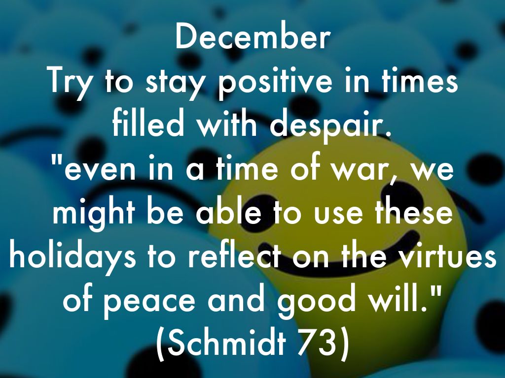 "even in a time of war, we might be able to use these holidays to reflect on the virtues of peace and good will."(Schmidt 73)