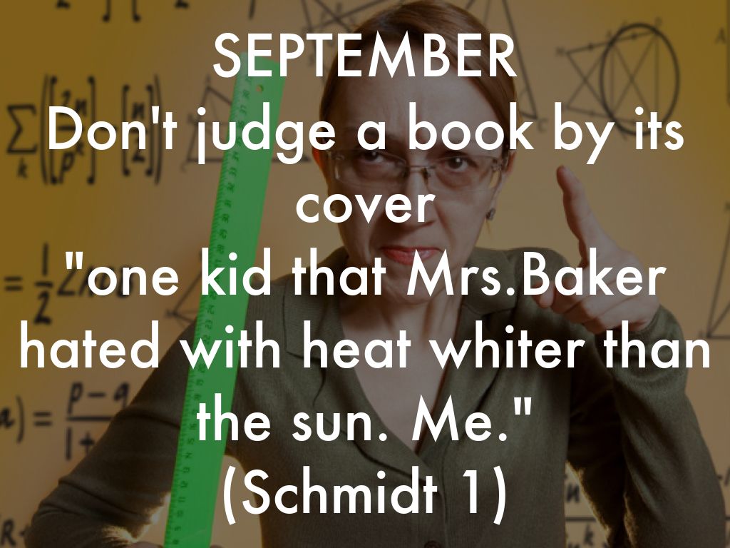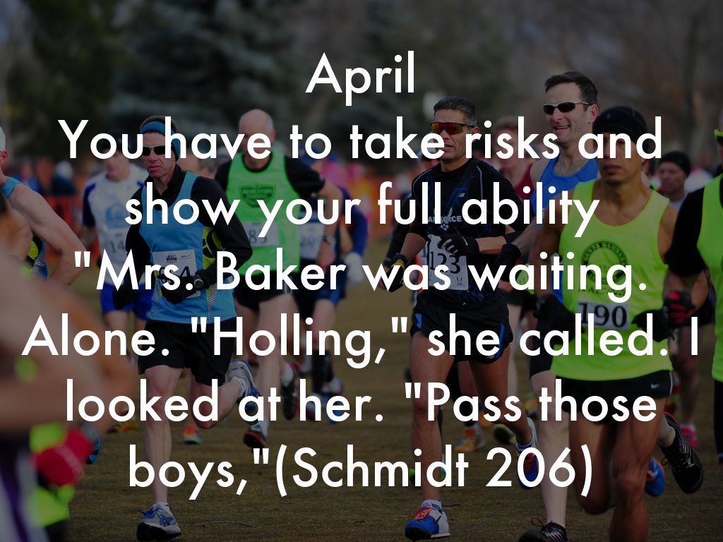 "Mrs. Baker was waiting. Alone. "Holling," she called. I looked at her. "Pass those boys,"(Schmidt 206)