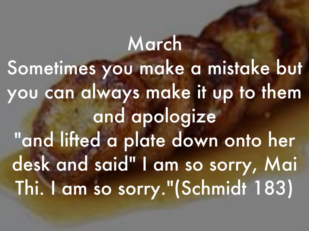 "and lifted a plate down onto her desk and said" I am so sorry, Mai Thi. I am so sorry."(Schmidt 183)