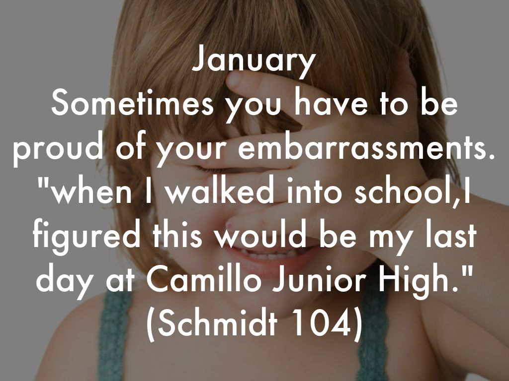 "when I walked into school,I figured this would be my last day at Camillo Junior High."(Schmidt 104)