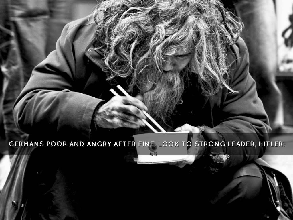 GERMANS POOR AND ANGRY AFTER FINE. LOOK TO STRONG LEADER, HITLER.