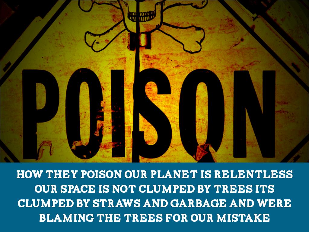 HOW THEY POISON OUR PLANET IS RELENTLESS OUR SPACE IS NOT CLUMPED BY TREES ITS CLUMPED BY straws and GARBAGE AND WERE BLAMING THE TREES FOR OUR MISTAKE