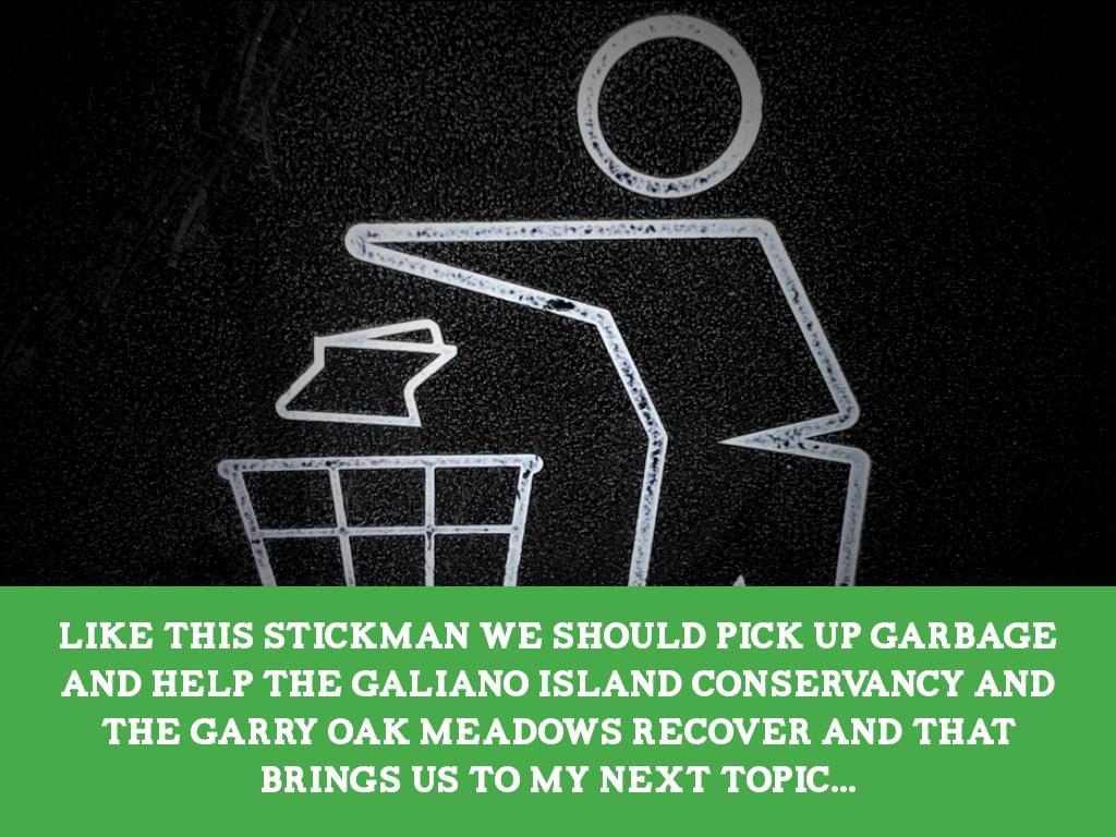 like this stickman we should pick up garbage and help the galiano island conservancy and the garry oak meadows recover and that brings us to my next topic...