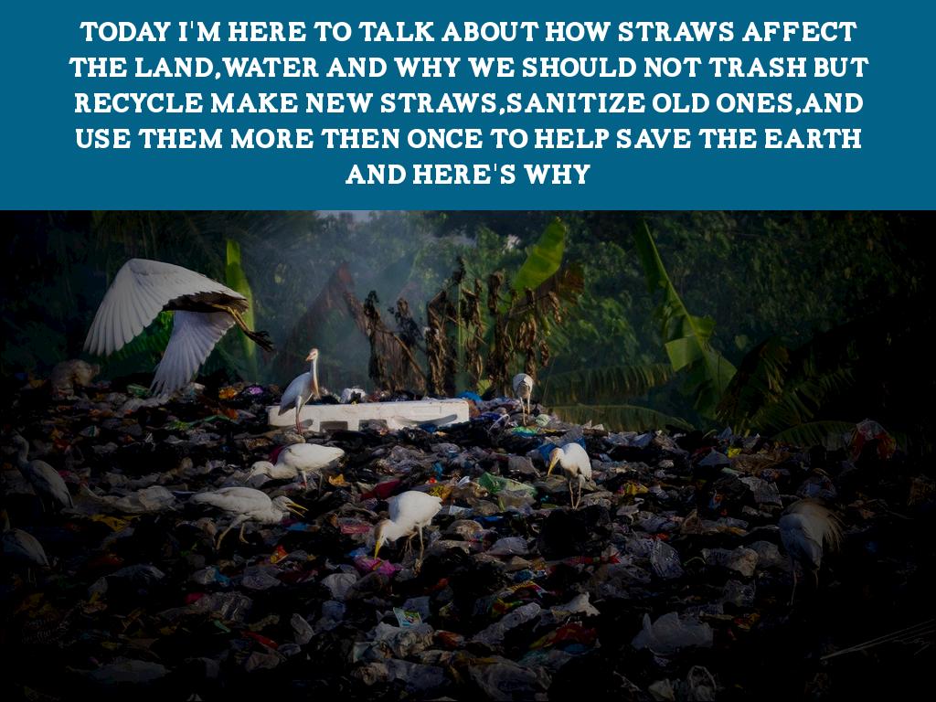 Today I'm here to talk about how straws affect the land,water and why we should not trash but recycle make new straws,sanitize old ones,and use them more then once to help save the earth and here's why
