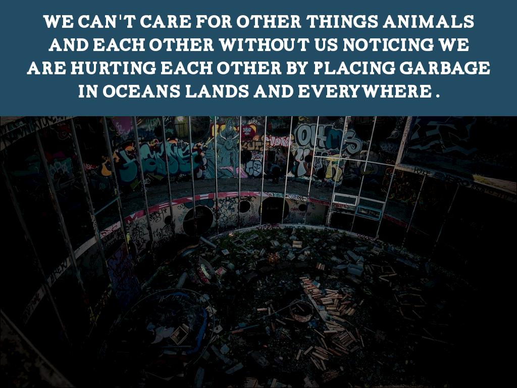 we can't care for other things animals and each other without us noticing we are hurting each other by placing garbage in oceans lands and everywhere .
