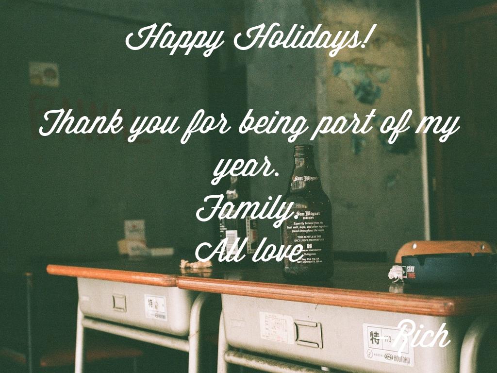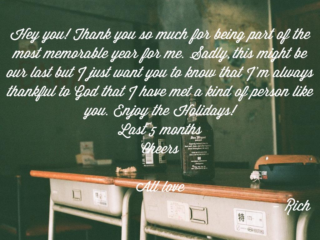Hey you! Thank you so much for being part of the most memorable year for me. Sadly, this might be our last but I just want you to know that I’m always thankful to God that I have met a kind of person like you. Enjoy the Holidays! Last 5 months Cheers