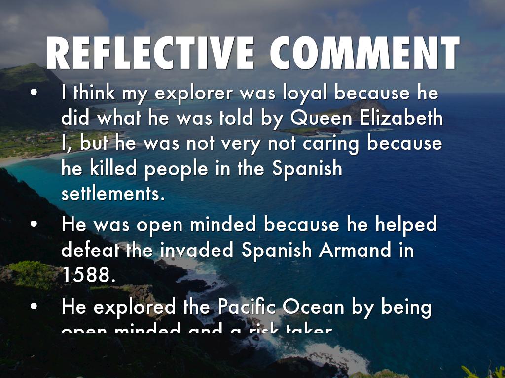 I think my explorer was loyal because he did what he was told by Queen Elizabeth I, but he was not very not caring because he killed people in the Spanish settlements.