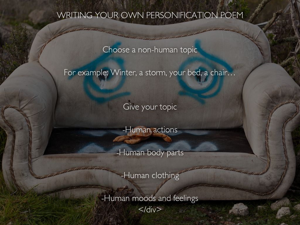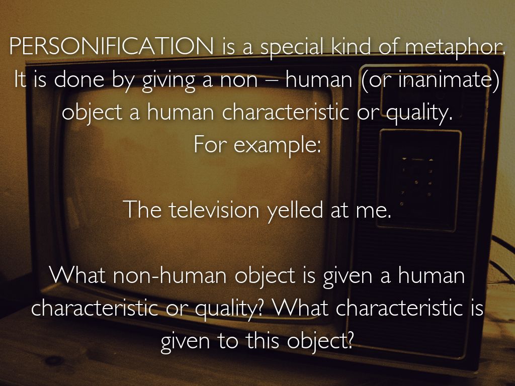 PERSONIFICATION is a special kind of metaphor. It is done by giving a non – human (or inanimate) object a human characteristic or quality. For example:
