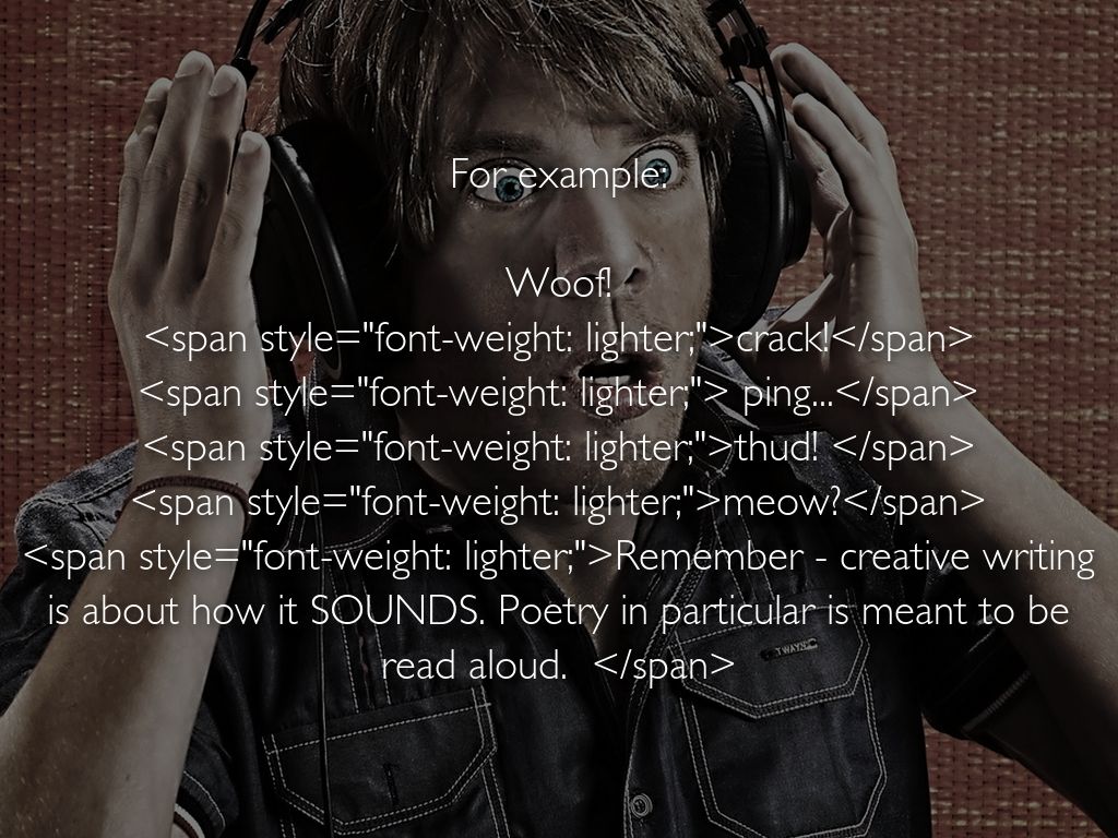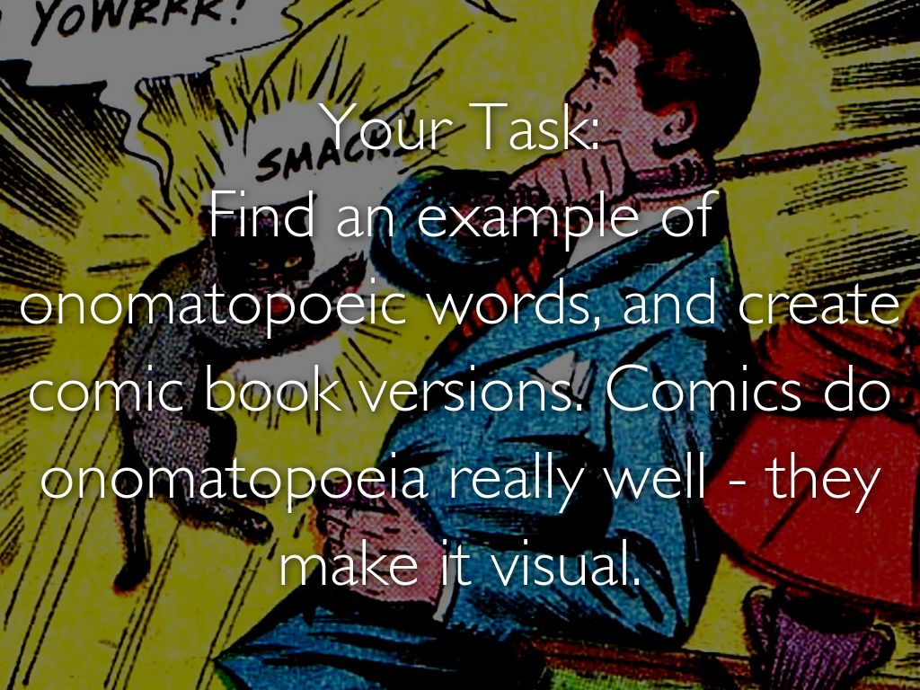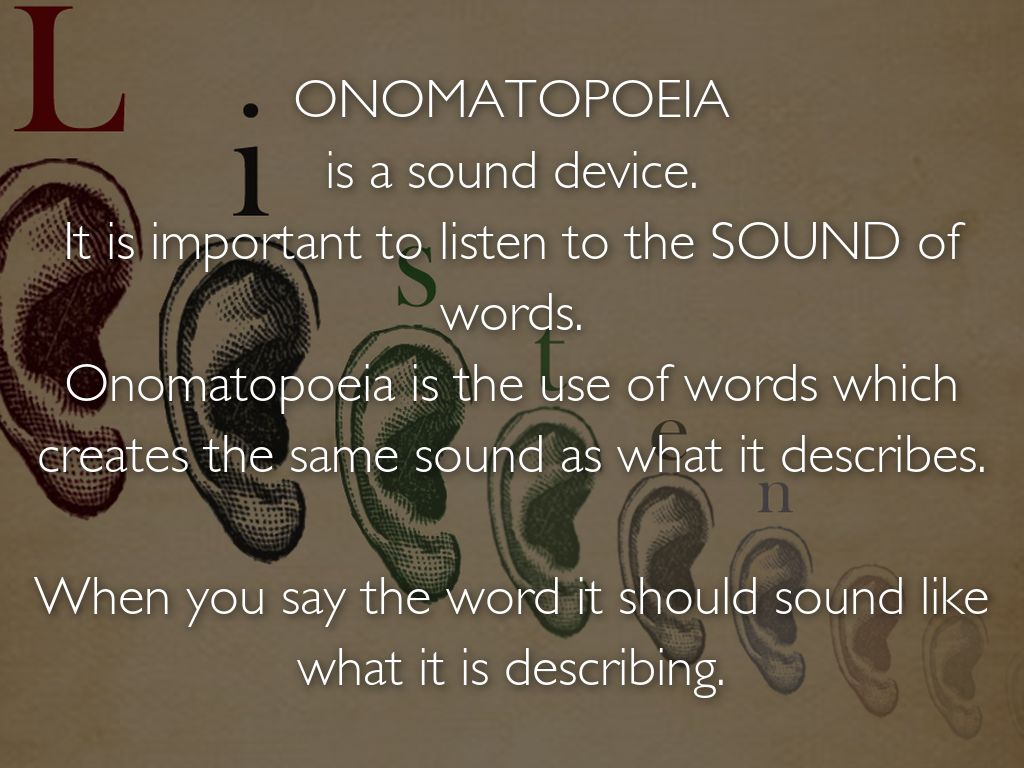 ONOMATOPOEIA is a sound device. It is important to listen to the SOUND of words. Onomatopoeia is the use of words which creates the same sound as what it describes.
