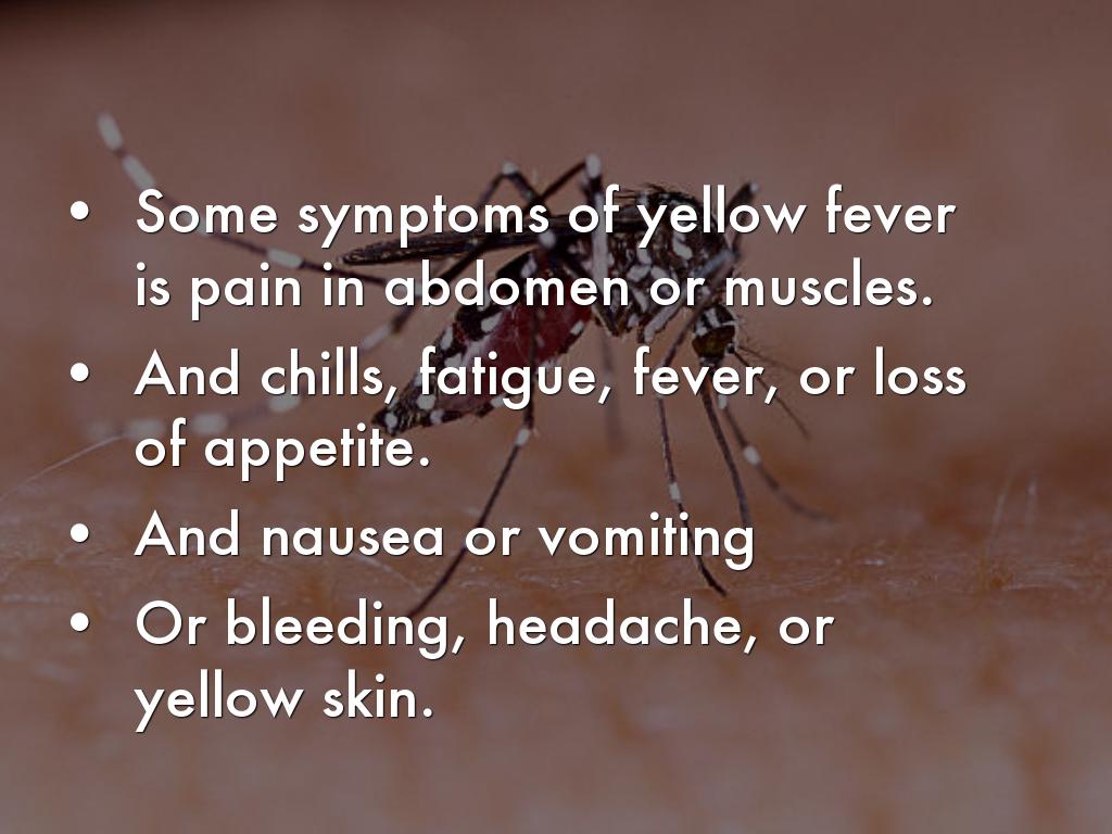 - Some symptoms of yellow fever is pain in abdomen or muscles.