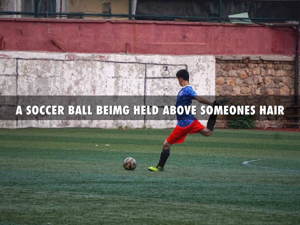 A SOCCER BALL BEIMG HELD ABOVE SOMEONES HAIR