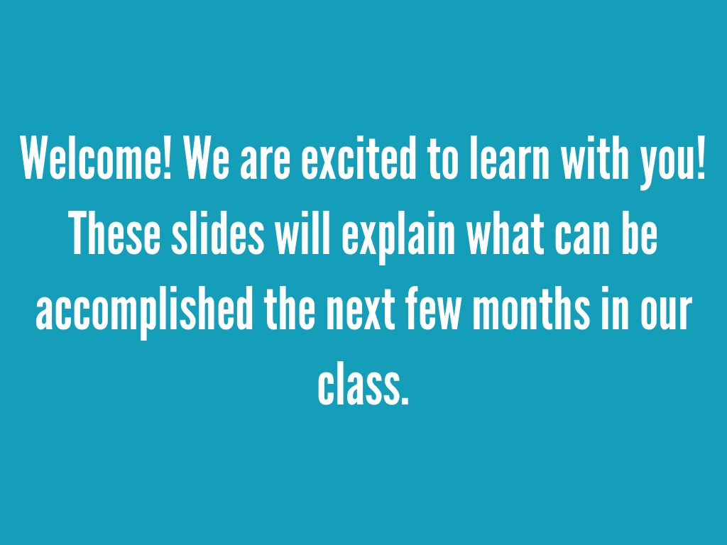 Welcome! We are excited to learn with you! These slides will explain what can be accomplished the next few months in our class.