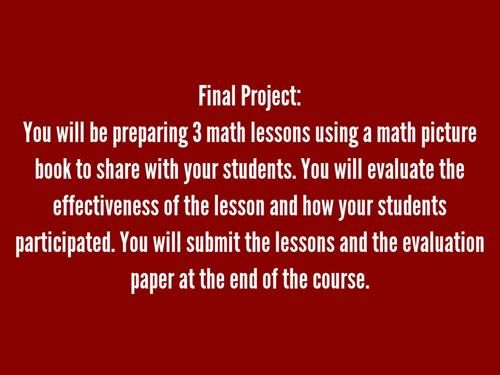 You will be preparing 3 math lessons using a math picture book to share with your students. You will evaluate the effectiveness of the lesson and how your students participated. You will submit the lessons and the evaluation paper at the end of the course.