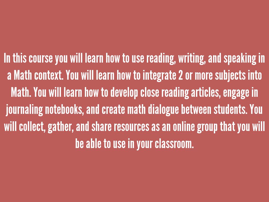 In this course you will learn how to use reading, writing, and speaking in a Math context. You will learn how to integrate 2 or more subjects into Math. You will learn how to develop close reading articles, engage in journaling notebooks, and create math dialogue between students. You will collect, gather, and share resources as an online group that you will be able to use in your classroom.