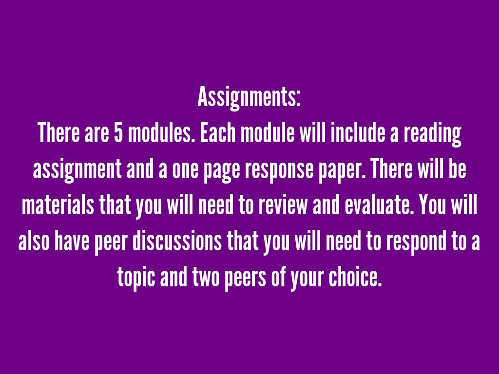 There are 5 modules. Each module will include a reading assignment and a one page response paper. There will be materials that you will need to review and evaluate. You will also have peer discussions that you will need to respond to a topic and two peers of your choice.