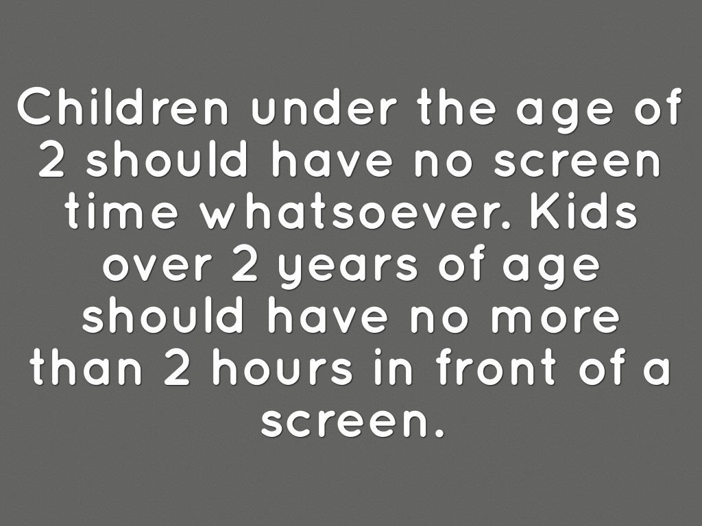 Children under the age of 2 should have no screen time whatsoever. Kids over 2 years of age should have no more than 2 hours in front of a screen.