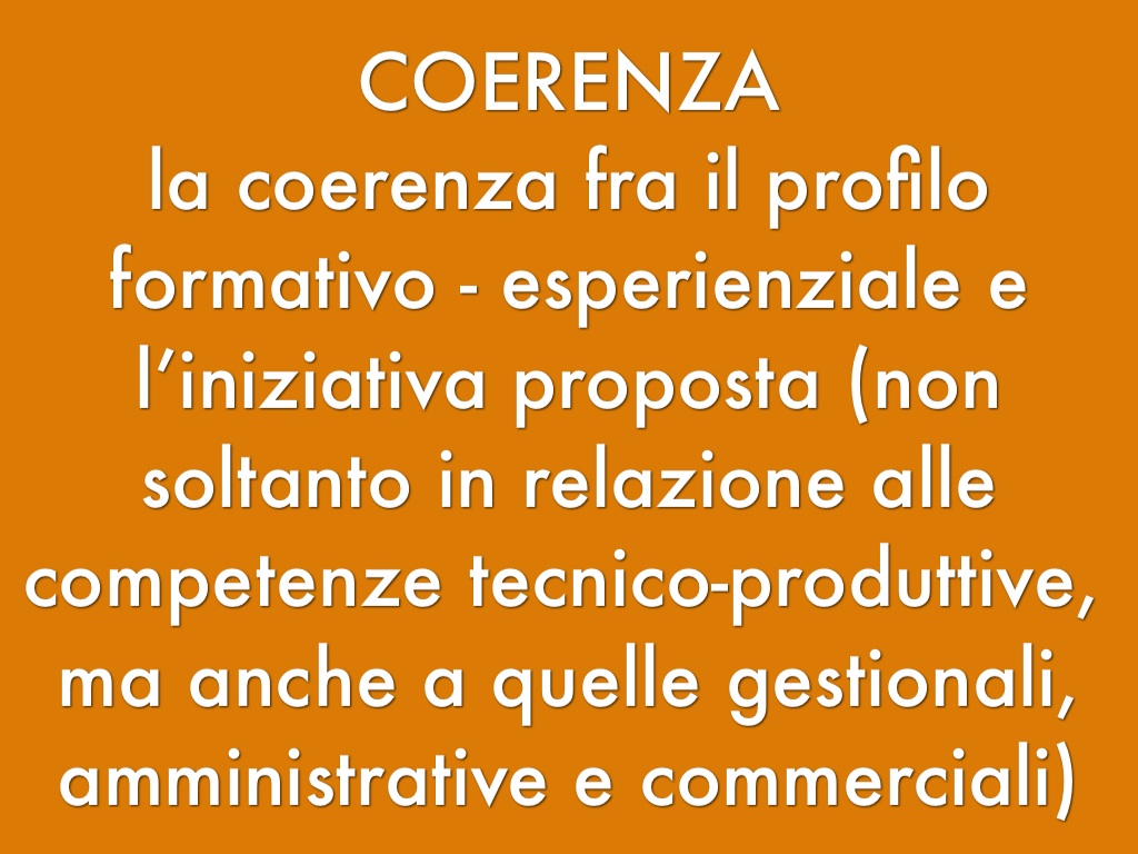 la coerenza fra il profilo formativo - esperienziale e l’iniziativa proposta (non soltanto in relazione alle competenze tecnico-produttive, ma anche a quelle gestionali, amministrative e commerciali)
