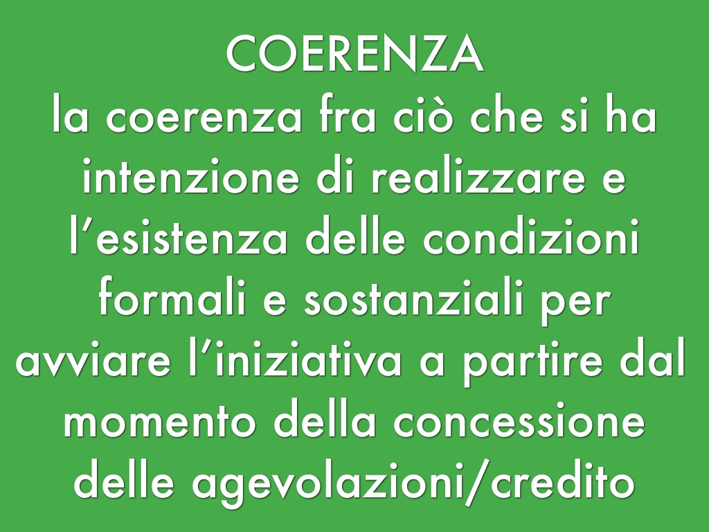 la coerenza fra ciò che si ha intenzione di realizzare e l’esistenza delle condizioni formali e sostanziali per avviare l’iniziativa a partire dal momento della concessione delle agevolazioni/credito