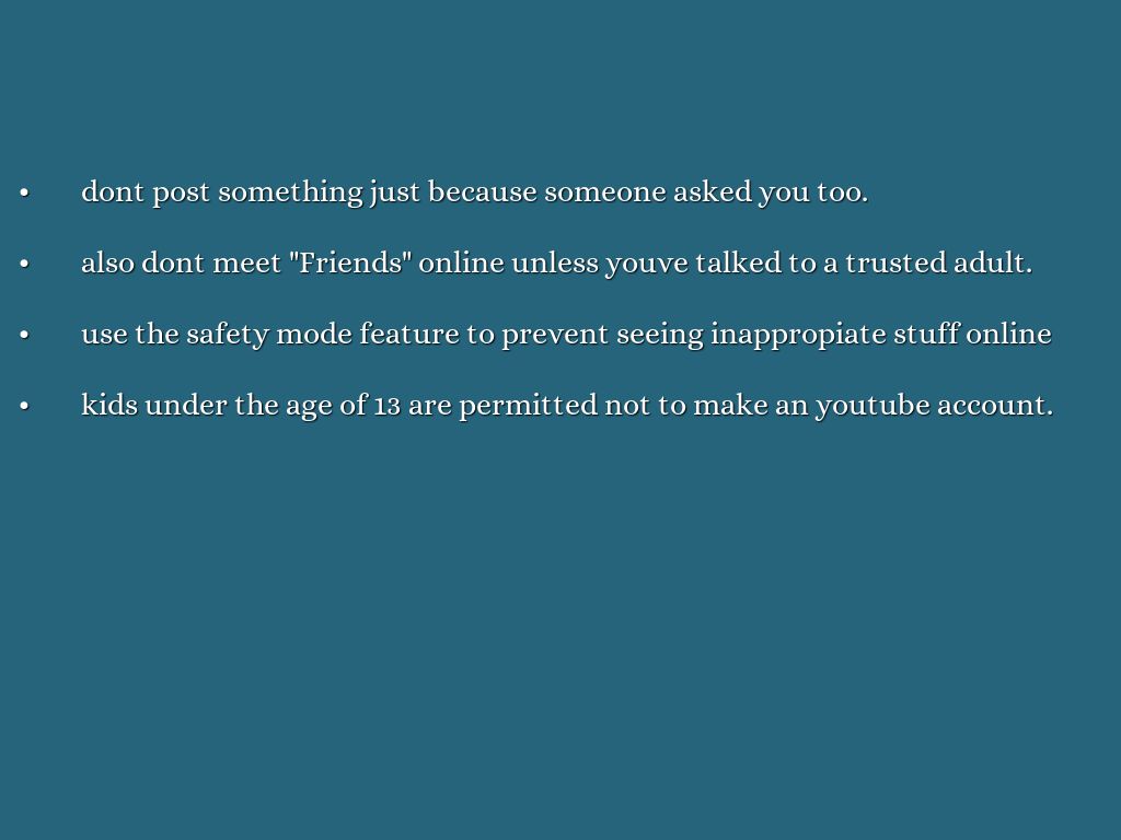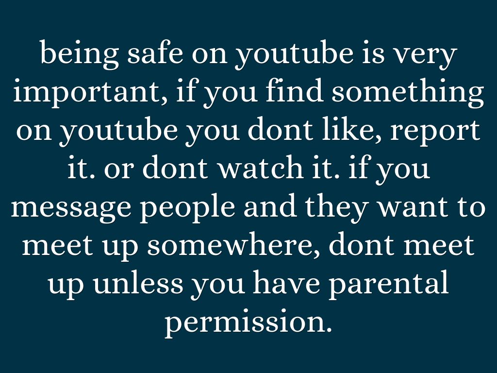 being safe on youtube is very important, if you find something on youtube you dont like, report it. or dont watch it. if you message people and they want to meet up somewhere, dont meet up unless you have parental permission.