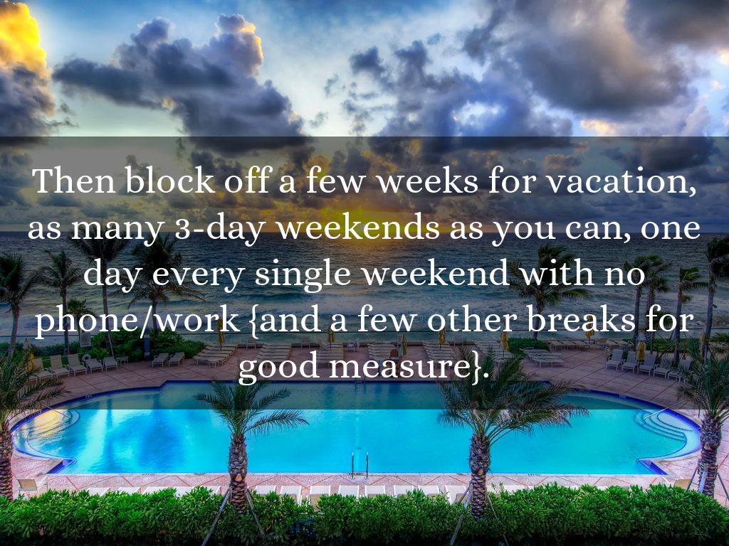 Then block off a few weeks for vacation, as many 3-day weekends as you can, one day every single weekend with no phone/work {and a few other breaks for good measure}.