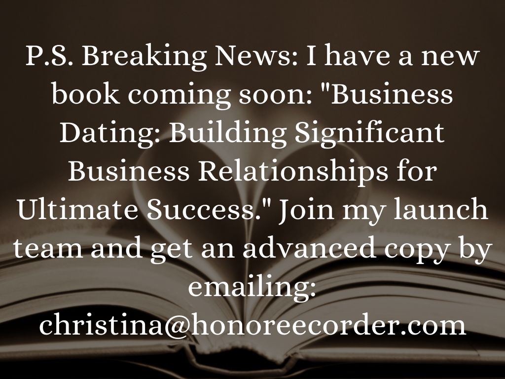 P.S. Breaking News: I have a new book coming soon: "Business Dating: Building Significant Business Relationships for Ultimate Success." Join my launch team and get an advanced copy by emailing: christina@honoreecorder.com