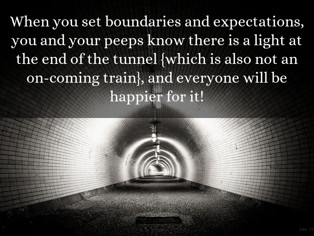 When you set boundaries and expectations, you and your peeps know there is a light at the end of the tunnel {which is also not an on-coming train}, and everyone will be happier for it!