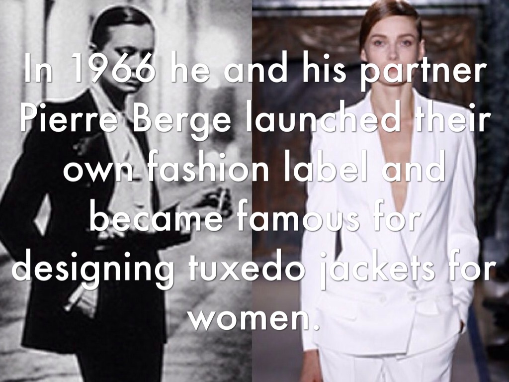In 1966 he and his partner Pierre Berge launched their own fashion label and became famous for designing tuxedo jackets for women.