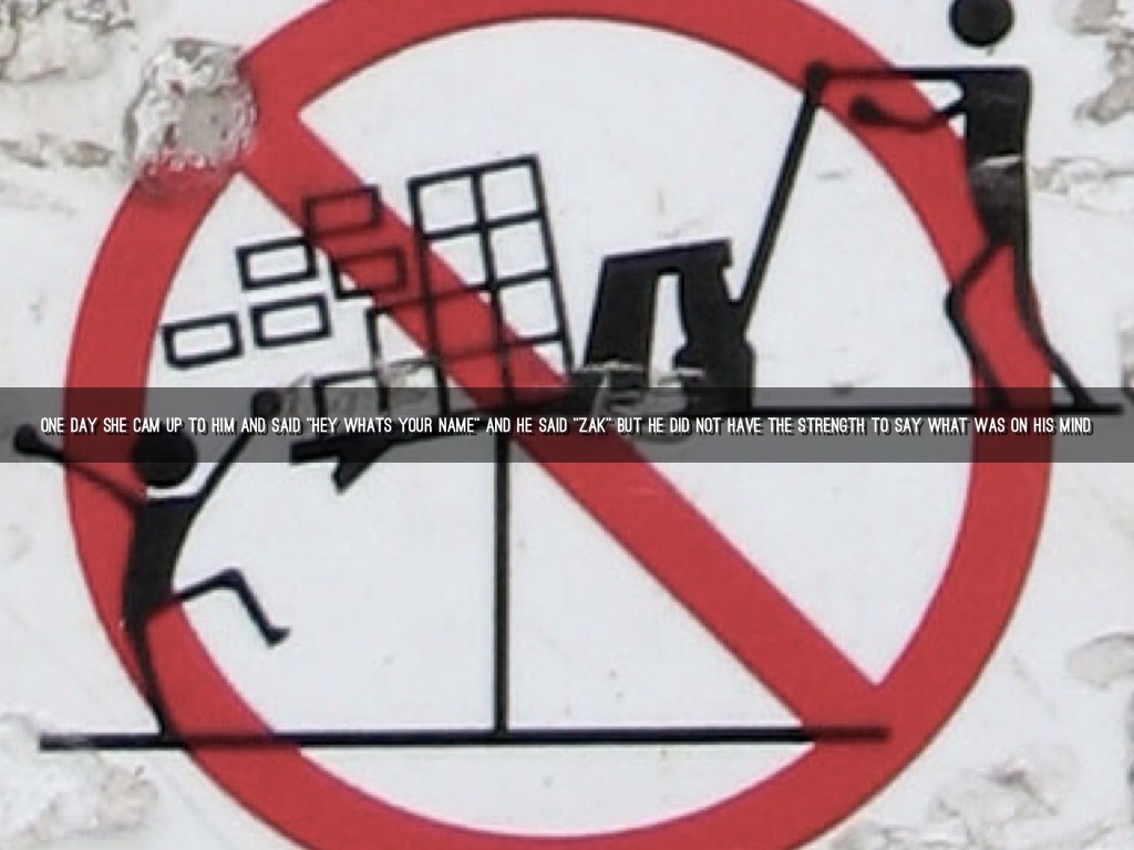 ONE DAY SHE CAM UP TO HIM AND SAID "HEY WHATS YOUR NAME" AND HE SAID "ZAK" BUT HE DID NOT HAVE THE STRENGTH TO SAY WHAT WAS ON HIS MIND