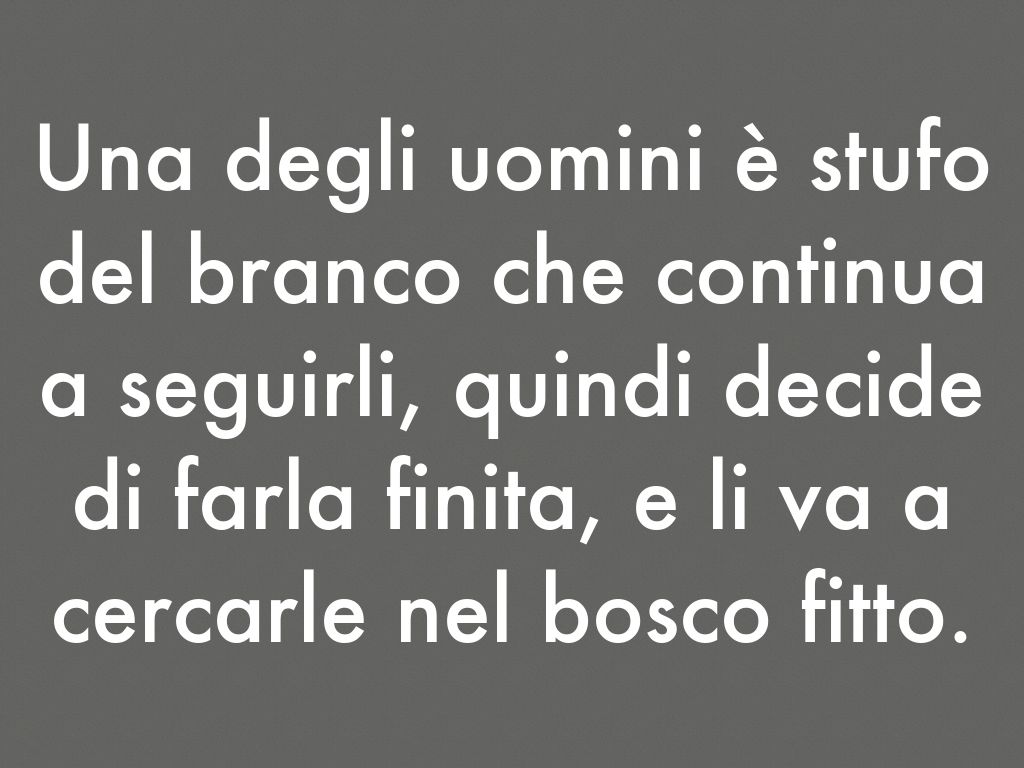Una degli uomini è stufo del branco che continua a seguirli, quindi decide di farla finita, e li va a cercarle nel bosco fitto.
