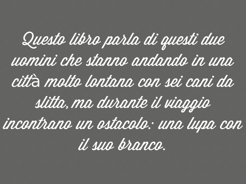 Questo libro parla di questi due uomini che stanno andando in una città molto lontana con sei cani da slitta, ma durante il viaggio incontrano un ostacolo: una lupa con il suo branco.