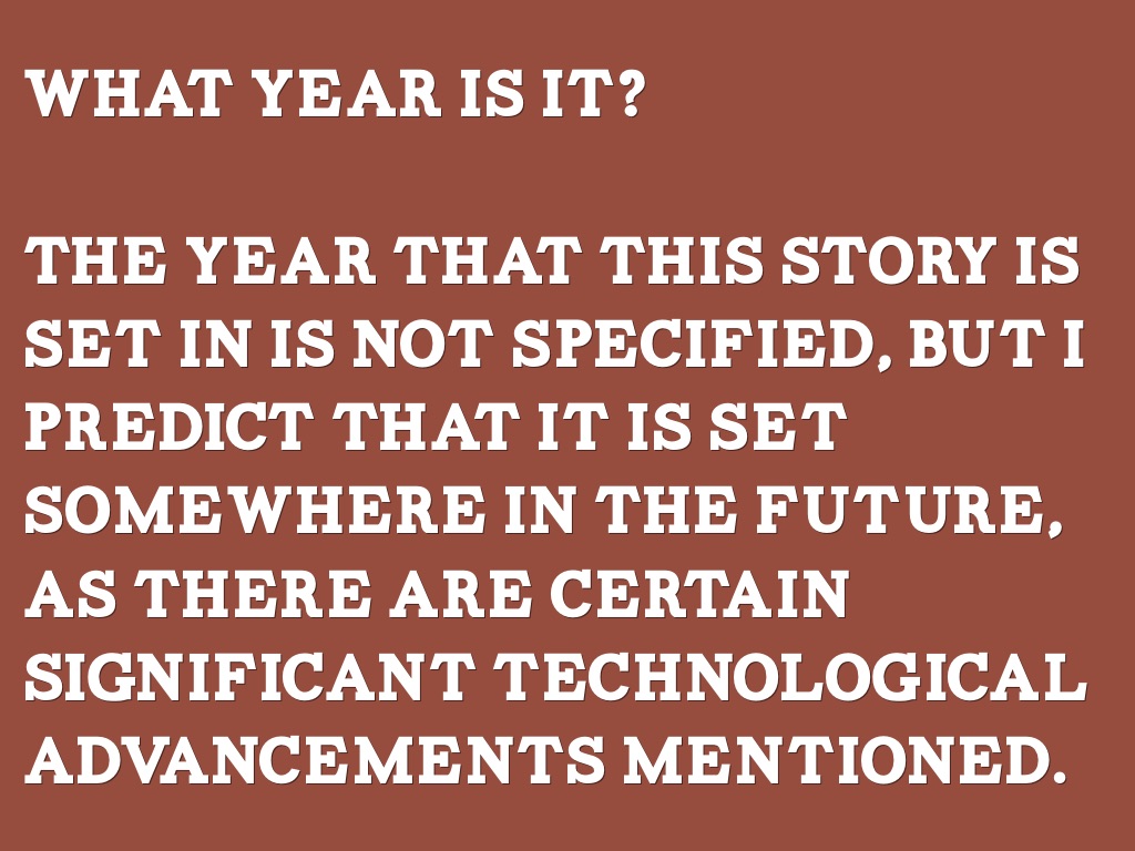 The year that this story is set in is not specified, but I predict that it is set somewhere in the future, as there are certain significant technological advancements mentioned.